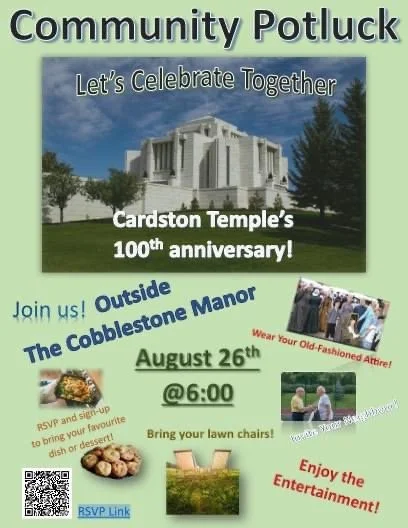 Community Potluck Saturday, August 26, 2023 6:00 p.m. 8:20 p.m. The Cobblestone Manor 173 7 Avenue West Cardston, AB, T0K 0K0 Canada (map) Google Calendar ICS